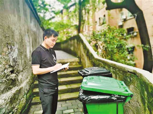 王迪在社區檢查垃圾分類情況。記者 張莎 攝\視覺重慶