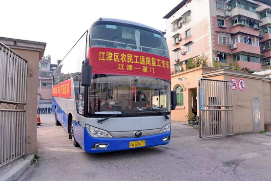 人民網重慶2月22日電 21日上午10時,兩輛載著60名務工人員的“返崗復工免費專車”從重慶江津區白沙鎮客運中心緩緩駛出,前往廈門市翔安區。據悉,這是江津為保障農民工安全有序返崗開行的首趟跨省“點對點”務工免費專車。