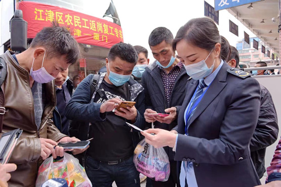 為保障這些外出務工人員安全有序出行,江津區組織相關單位,積極結合疫情防控網格化管理和返鄉人員日監測工作機制,建立了返鄉務工人員實名制信息和返崗復工人員出行需求臺賬,在此基礎上協同公安、交通、運輸等部門,對集中出行人員實施“分組編隊、準備物資、請前提醒、出發簽到、途中銜接、抵達對接”,科學合理地制定出行方案,共同助力務工人員“點對點”返崗。