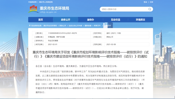 人民網重慶2月25日電(胡虹)重慶市生態環境局25日發布消息稱,2021年1月,重慶市生態環境局發布了《重慶市規劃環境影響評價技術指南——碳排放評價(試行)》《重慶市建設項目環境影響評價技術指南——碳排放評價(試行)》(渝環〔2021〕15號,簡稱《指南》),該《指南》已于2021年1月26日起實施。據了解,上述兩個《指南》也是國內首批規劃及建設項目環評中碳排放評價指南。
