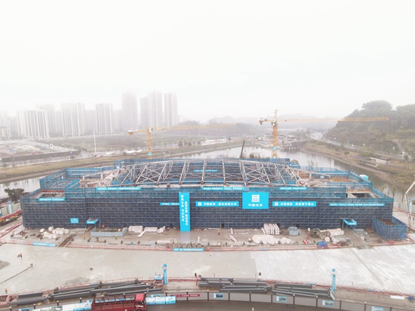 人民網重慶3月1日電 近日,伴隨著最后一根腹桿檁條焊接拼裝完成,重慶禮嘉智慧公園白云湖會議中心項目順利完成屋面鋼結構封頂。