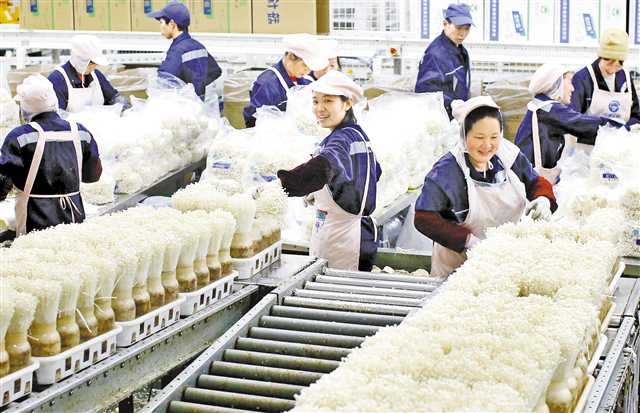 2月28日,萬盛華綠公司生產車間,員工在轉運生長中的金針菇出菇瓶。