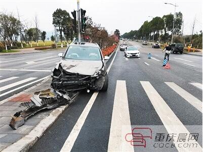 接到報警后,民警立即趕赴現場,發現一臺起亞轎車被逆向撞停在渝江大道快車道上,右側車身損毀嚴重,車內右側安全氣囊全開,右前輪轂安全碎裂,而另一臺大眾高爾夫轎車被逆向撞停在道路中央二次過街安全島上,車內前排安全氣囊全開,車頭幾乎被撞沒了,幾近報廢。