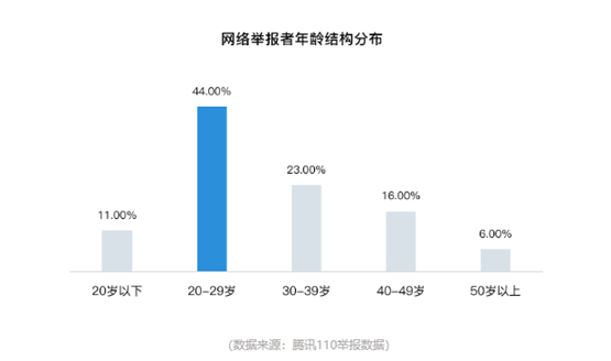 網絡詐騙舉報者整體呈年輕化。舉報者年齡介于20-29歲之間的比重達44%,占舉報用戶近五成。