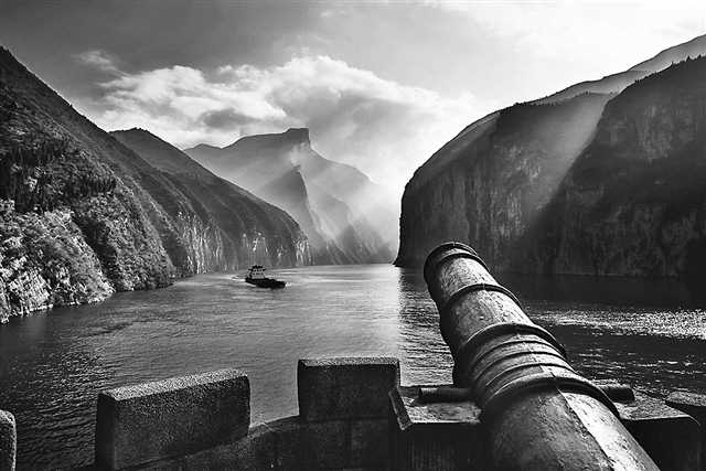 漫步在古徑幽林,看峽口那紅了又綠、綠了又紅的紅葉,撲面而來的,除了江風,還有讓人流連忘返的詩歌的清香;站在烽火臺前,撫摸那斑駁的大炮,那震天的戰鼓和越云的廝殺聲仿佛就響在耳邊,烽煙滾滾金戈鐵馬的古戰場仿佛就浮現在眼前;佇立白帝城之巔,長江三峽第一峽——瞿塘峽就展現在眼前,赤甲山和白鹽山對峙,鎖住了長江的咽喉,形成雄偉壯美的夔門;俯視腳下,昔日咆哮奔騰的長江水,如今安靜得如嫻淑的少女,輕盈地與夔門擦身而過,穿過綿綿群山延伸到遠方。一霎時,初升的太陽躍出赤甲山頂,陽光撕開布滿峽谷的晨霧,灑下一江的緋紅。江上微波粼粼,閃爍著點點金光,巍巍夔門便在這光與影的交錯中多了幾分妖嬈與嫵媚。