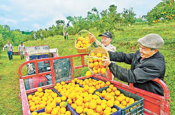 三月三日,渝北區大盛鎮青龍村,村民們正在采收成熟的沃柑,臉上露出了幸福的微笑。
