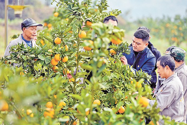 2月9日,渝北區大盛鎮青龍村,村黨總支書記黃志(右三)正在為果樹生產隊的村民們講解柑橘掛果后的管護知識。