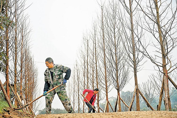 2月4日,渝北區大盛鎮青龍村,村民正在步道兩旁栽種行道樹。