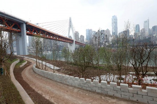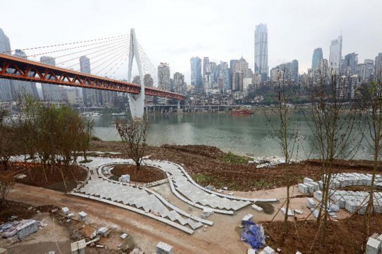 據江北區住房城鄉建委相關人士介紹,江北嘴江灘公園項目起于北濱路長安碼頭,止于塔子山觀音寺,岸線全長約6.1公里,分兩個標段建設。其中,嘉陵江段去年5月開工,長江段上月開工。目前,已完成千廝門大橋景觀節點處廣場鋪裝、景觀平臺鋪裝、重力式擋墻澆筑,近百名工人正投入緊張施工中。