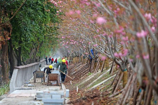 重慶日報全媒體消息,3月8日,記者來到大劇院附近的江北嘴江灘公園項目,看見沿岸護坡上大朵大朵的櫻花正在綻放。經過大半年建設,長嘉匯大景區重要項目之一——江北嘴江灘公園形象初顯。