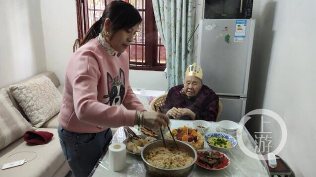 “婆婆腸胃不好,不能吃辣椒,我給她做個番茄雞蛋面?上]有買到壽桃,就用奶黃包代替了!敝芗t稱,自從2013年認識游婆婆以來,她每年都堅持給老人過生,并給她煮上一碗長壽面,希望婆婆能健康長壽。