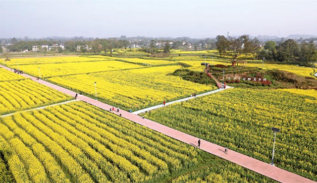 昨日,拾萬鎮長虹村千畝硒鍶油菜苔基地里,盛放的油菜花猶如一片金色的海洋,為美麗鄉村添色彩、增詩意,吸引了不少游客在這里游玩、采風。該基地采用優質稻油菜輪作模式,前一年統一旋耕、開溝、播種,3月賞花,6月收油菜籽,接著輪作晚稻,平均畝產油菜苔150公斤、油菜籽100公斤,畝均增收600元。