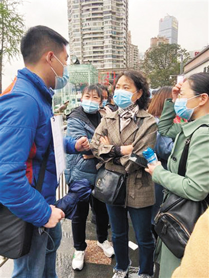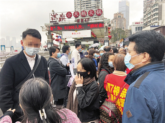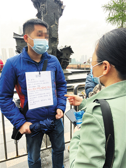小陳穿著一身藍色羽絨服,雖然戴著口罩,但眼神里卻透著一股精神勁兒。他胸前掛了一張打印的自我介紹:男,27歲,衛生健康委員會(事業編),獨生子,渝北區人,211本科,身高173,70公斤,工作經歷:……本人性格好,會煮飯,顧家庭,有責任心。尋:28歲以內,條件相當,性格好的女生。電話……