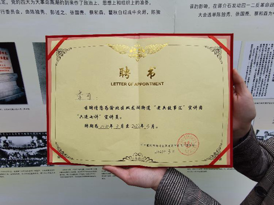 雙龍湖街道黨工委頒發給李可的宣講員聘書