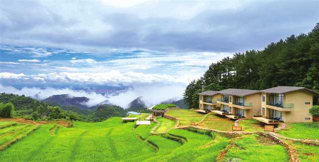 清晨,從高處俯視這間民宿,遠方是若隱若現的城市,近處是云霧繚繞的山野和布滿梯田的油菜花,泳池、書屋、稻田餐廳、觀景臺……目之所及,皆是游客打卡拍照的勝地。