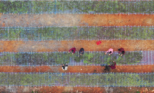 4月1日,村民在衡陽市衡東縣楊橋鎮虎塘村晾曬蕨菜(無人機照片)。