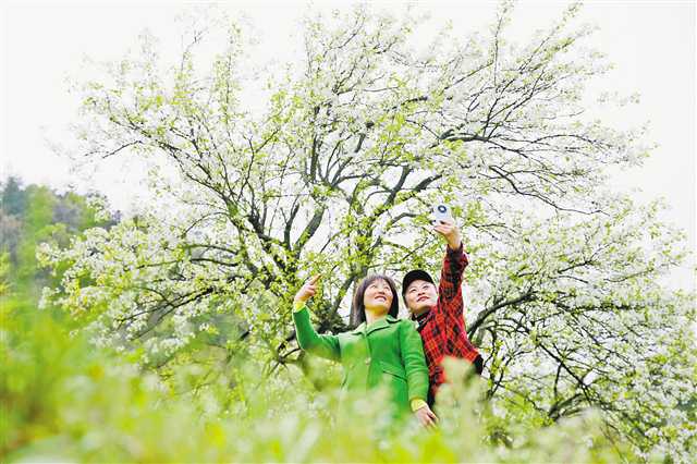 四月三日,游客在黔江區阿蓬江鎮海拔一千一百多米的彭家村高山梨園里游玩。特約攝影 楊敏\視覺重慶