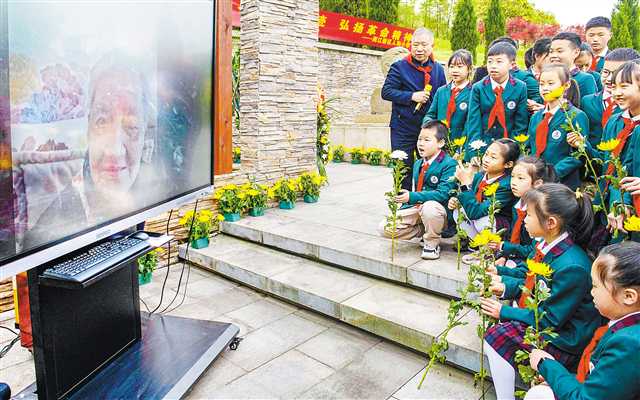 4月3日,在唐虛谷、楊袁善烈士陵園內,唐虛谷烈士的遺孀楊哲卿通過視頻勉勵同學。記者 張錦輝 攝/視覺重慶