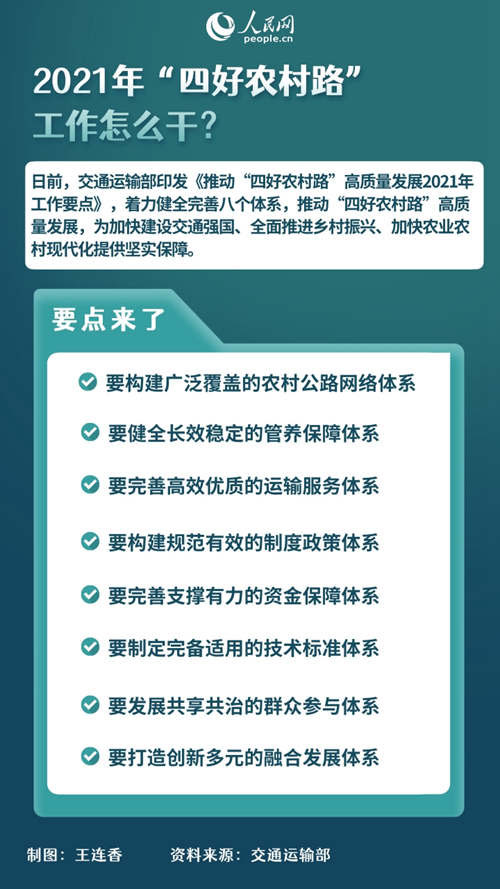 據交通運輸部消息,日前,交通運輸部印發《推動“四好農村路”高質量發展2021年工作要點》,著力健全完善八個體系,推動“四好農村路”高質量發展,為加快建設交通強國、全面推進鄉村振興、加快農業農村現代化提供堅實保障。