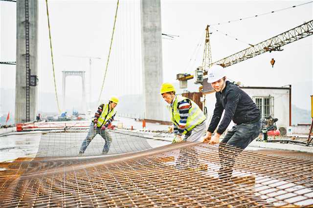 4月6日,長壽長江二橋施工現場,工人正在橋面施工。該橋是特大型市政橋梁,起于晏家工業園區化中大道,上跨川維鐵路支線,跨越長江后,終于茶涪路,線路全長3833米。目前,大橋主體結構基本完成,正在進行通車前欄桿附屬、路面鋪裝、景觀照明、交安綠化等施工,預計6月底建成通車。
