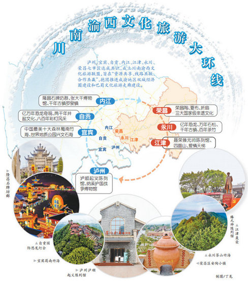 川南和渝西地區地緣相鄰、山水相連、人文相親、產業相融。今年2月,在川南渝西七市區文化旅游營銷工作會上,瀘州、宜賓、自貢、內江、江津、永川、榮昌七市區達成共識,成立川南渝西文化旅游聯盟,旨在“資源共享、線路共聯、合作共贏”,抱團推進成渝地區雙城經濟圈建設和巴蜀文化旅游走廊建設。
