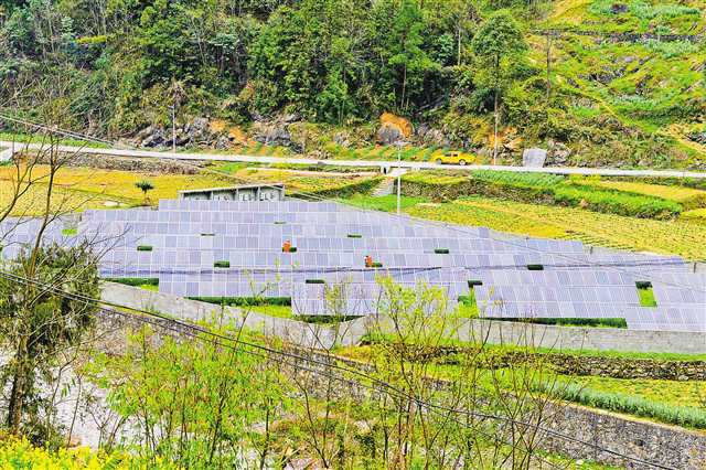 4月13日,巫溪縣紅池壩鎮漁沙村村級光伏扶貧電站內,一排排藍色光伏發電板正在發電。(國網重慶巫溪供電公司供圖)