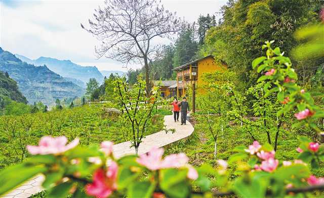 沿著一片粉色木瓜花海一路往下,就到了老黨員馬培清家。如今,馬家院壩成了游客“打卡”的地方,不少游客正在小樓前拍照留念。小樓一側,由馬家舊豬圈改成的中華主題郵局里增加了土特產品和飲料,閑置的閣樓改造成“初心書屋”,供游客休閑閱讀。馬培清的兒媳婦譚明蘭兼售貨員、書屋管理員,還在非遺扶貧就業工坊做手工,忙得團團轉。