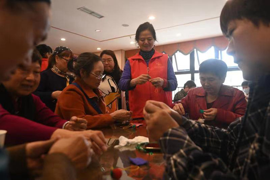 手里針線翻飛,打個結,籠成一個絡子,走個圈,凝成一個小兜。志愿者蔣玲均甜美的笑容,融化了很多老年人的心。