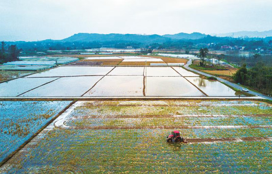 村民駕駛著翻耕機耕田,綠油油的平野繪制成一幅美麗的耕春圖。向成國攝