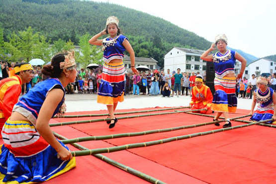 百里竹海旅游度假區極具特色的“竹竿舞”互動體驗項目。 張常偉攝
