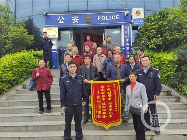 4月14日上午,22名老人一路敲鑼打鼓將一面印有“人民好警察 辦事很認真 為民辦實事 追回被騙金”的錦旗和一封感謝信送到永川區來蘇派出所,為民警盡心盡責幫老人們挽回損失表示感謝。