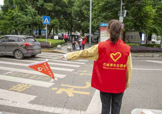 啟動儀式后,青年志愿者們依次前往各大交通路口,開展“禮讓斑馬線,文明我點贊”交通文明勸導志愿服務活動,在巴南各交通要道形成了“青春志愿紅”的風景線。