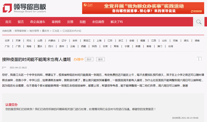 人民網重慶4月23日電 (陳琦)最近,網友通過人民網《領導留言板》留言,建議社區醫院周六周日也可以接種,方便上班族在休息日能帶孩子去。