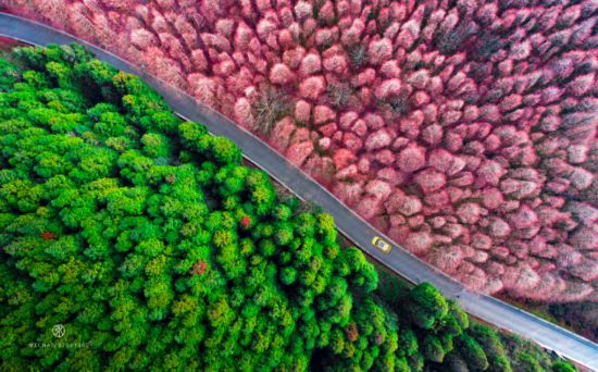 開往春天的列車!重慶軌道交通2號線佛圖關段,大面積的美人梅花盛開,單軌列車穿行在花海中,如開往春天的列車,成為一道城市亮麗的風景線。鄒樂 攝