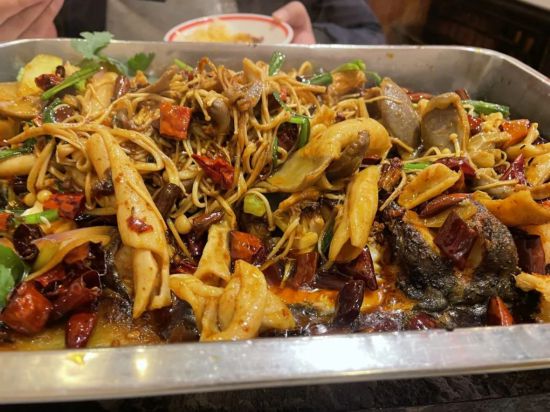 沙坪壩沈姐烤魚,雞雜配上烤魚,味道一絕。黃軍 攝
