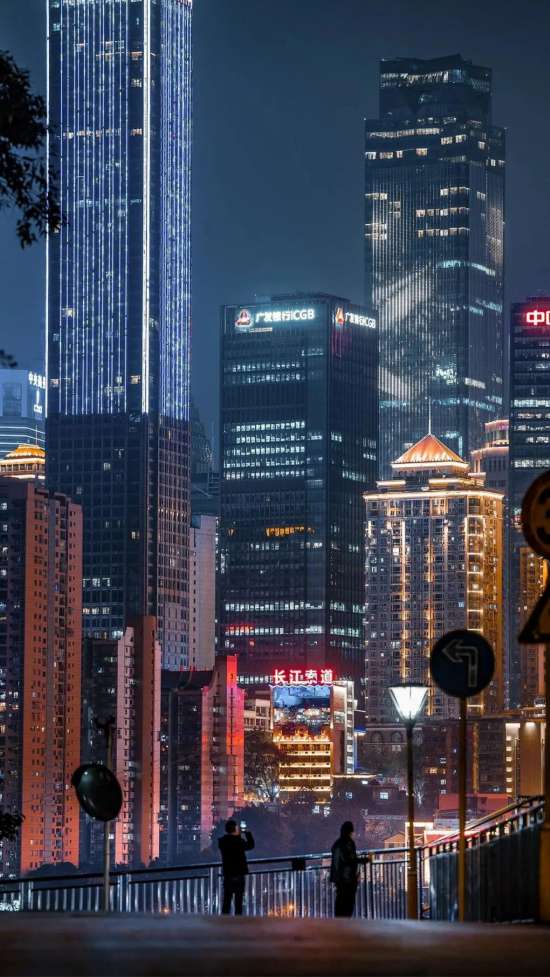 在充滿賽博朋克感的城市背景下,兩位觀賞夜景的市民仿佛成為了畫面中的主角,看起來既真實又科幻。張坤琨 攝