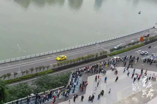 警方對千廝門大橋雙向交通采取臨時封閉,大橋儼然變成了一條“步行街”,游客們可以在橋面上隨意行走觀看,在“最佳拍照點”攝影、拍照留念。圖片來源:平安重慶