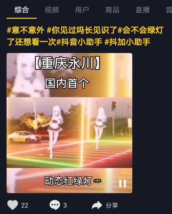 視頻的字幕中顯示:“重慶永川,網紅紅綠燈,為這個創意點贊!钡茸盅。