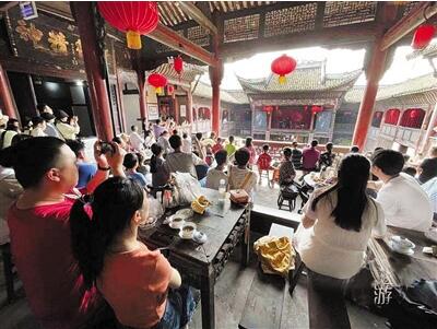此次銅梁原鄉文旅周也在文旅融合新玩法上進行了探索。比如在安居古城“唱”玩夜上演之前,古城主要景點也推出了一系列傳統文化活動。記者在現場看到,《翰林省親》《蚌姑戲沙彌》等傳統民俗表演節目的演員們身著戲服,以千年古城地標景點為舞臺,在游客中間進行表演,不但拉近了觀眾與演員的距離,也讓觀眾更好融入了傳統藝術氛圍里。大家看得津津有味,贊不絕口。眾多民俗節目展演展現了安居古城多元文化的魅力,傳統與現代在歲月靜好的千年古城碰撞出不一樣的火花。