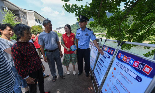 5月10日,在浙江省杭州市臨安區龍崗鎮湯家灣村,反詐志愿者服務隊成員給村民宣講如何防范新型電信詐騙。