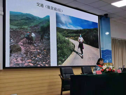 “這是涼山人脫貧前和脫貧后的房屋對比圖。脫貧前,房屋內十分昏暗,拍照時大家臉上都沒什么笑容。脫貧后,大家搬進敞亮的兩層小樓,還有了獨衛和太陽能熱水器,他們興奮地拉著我進屋合影留念!眻蟾鏁F場,謝彬蓉眼含淚光,用一張張照片、一個個來源于生活的生動例子向在場師生們講述大涼山近年來的脫貧故事。接地氣的語言、樸實的案例、謝彬蓉的奉獻精神讓師生們頗受感動,大家聽得津津有味,頻頻自發鼓掌。
