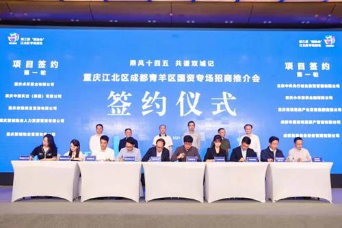 在重點項目推介活動上,江北區、青羊區國企代表分別對明月山-御臨河生態文化旅游區、科技金融中心、青羊總部經濟基地項目、四川國際創新設計產業園等項目進行了推介,涵蓋文旅、康養、商業街區、園區、總部基地、地產開發等多個產業。推介會上,中科江北基金項目、中國成都人力資源產業園等20個重點項目完成簽約,簽約總金額達46億元。
