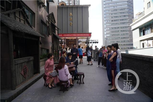 順著渝中區觀音巖通往抗建堂劇場的小路而上,不時有身著長衫、旗袍和中山裝的年輕男女擦肩而過,老重慶的水果攤、茶館和小食店也一一出現在路邊……