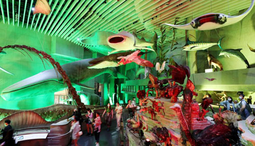 5月18日,參觀者在上海自然博物館生命長河展區參觀。