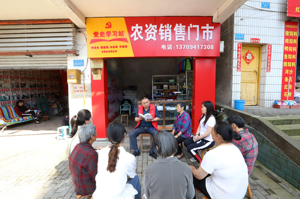 黨史學習教育開展以來,王家社區黨總支為便于黨員、群眾開展黨史學習,一直都想在場鎮開辟一個專門的黨史學習站。開始,社區黨總支選了幾個地址,都不合適。經過實地查看,蔣渝紅想到了黨員李學金的農資銷售門市就在王家車站對面,人流量大,是個不錯的位置,便把這個想法和李學金說了!拔沂屈h員先鋒隊的政策宣講崗成員,把學習站設置在我這里再合適不過了!崩顚W金立刻答應了下來。