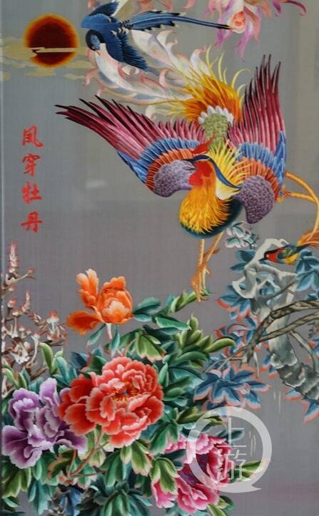 畫景中大、中、小3只鳳凰棲息在一簇簇牡丹上,傳說彩虹出來時刺繡能迎福接祥,祈禱平安,所以吳玉英從40歲開始,收集百家絲線,堅持只在彩虹下飛針走線,彩虹消退后即停止,直到81歲才完成這幅不朽之作,成為金珠苗繡備受推崇和敬仰的標桿。