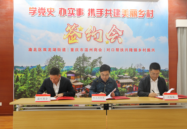 人民網重慶5月25日電 5月24日,渝北區雙龍湖街道辦事處聯合重慶市溫州商會,與興隆鎮政府簽署鄉村振興對口幫扶協議。雙龍湖街道是興隆鎮鄉村振興結對幫扶單位,而重慶市溫州商會黨委則是雙龍湖街道跨域黨建共建單位,溫州商會此次是被專程請來助力鄉村振興的“幫幫團”。