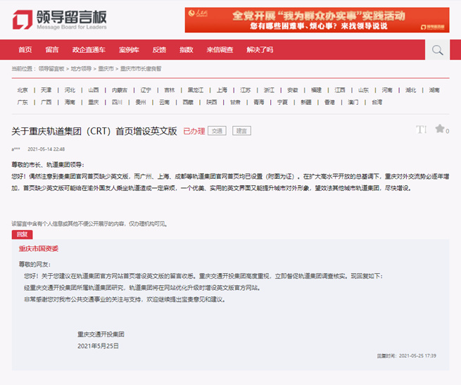 經重慶交通開投集團所屬軌道集團研究,軌道集團將在網站優化升級時增設英文版官方網站。