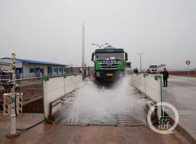 剛好,一輛渣土車正準備出場。只見車輛先通過第一個過水槽,依靠車輪自轉清洗掉大部分泥土,再駛入自動洗車臺,利用全自動噴水管沖洗車輪、車身,然后駛入第二個過水槽,進行二次清洗。