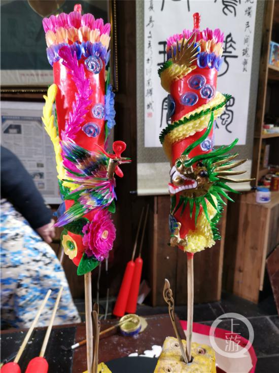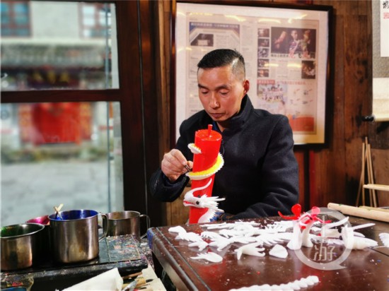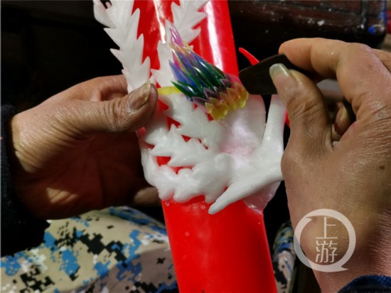 陳建友說,30歲的他已經基本能獨立完成一對龍鳳花燭的制作了,但他做出來的龍總感覺有點不到位,“當時,不論是家里人還是來參觀的街坊鄰居,都說‘你這個不像龍啊,倒像馬’”。